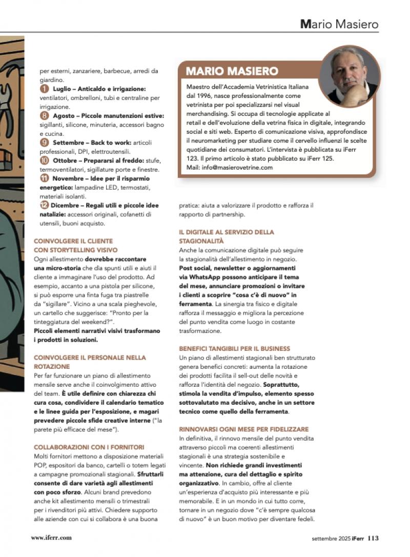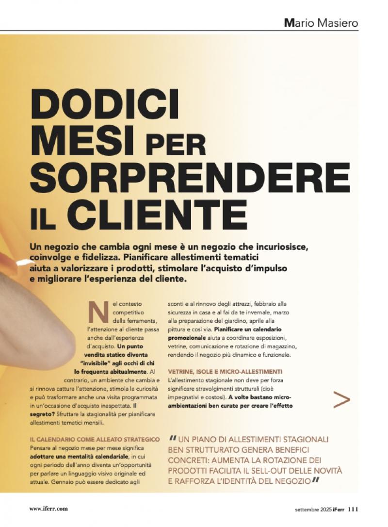 In definitiva, il rinnovo mensile del punto vendita attraverso piccoli ma coerenti allestimenti stagionali è una strategia sostenibile e vincente. Non richiede grandi investimenti ma attenzione, cura del dettaglio e spirito organizzativo. In cambio, offre al cliente un’esperienza d’acquisto più interessante e più memorabile. E in un mondo in cui tutto corre, tornare in un negozio dove “c’è sempre qualcosa di nuovo” è un buon motivo per diventare fedeli.Leggi la rivista: https://iferr.com/sfogliabili/iFerrMagazine/2025/iferr-127/