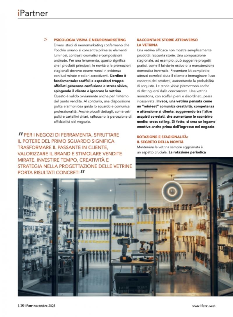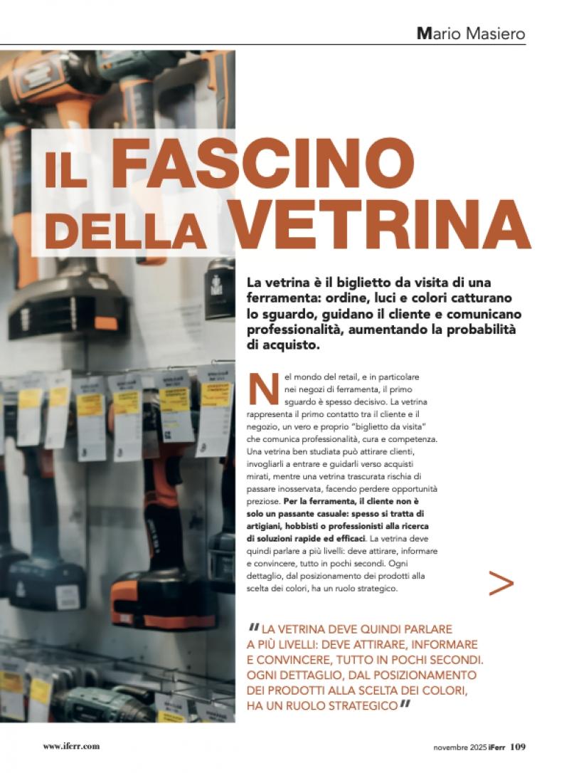 In definitiva, la vetrina è molto più di una semplice esposizione: è il primo punto di contatto, una forma di comunicazione silenziosa ma potentissima. Per i negozi di ferramenta, sfruttare il potere del primo sguardo significa trasformare il passante in cliente, valorizzare il brand e stimolare vendite mirate. Investire tempo, creatività e strategia nella progettazione delle vetrine porta risultati concreti: clienti più coinvolti, percezione positiva del negozio e un vantaggio competitivo evidente. Ogni passante che si ferma a osservare può diventare un cliente soddisfatto, pronto a tornare.link rivista: https://iferr.com/sfogliabili/iFerrMagazine/2025/iferr-129/112/